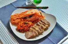수육은 김치와 함께 먹으면 가장 잘 어울립니다. 쌈 채소와 함께 먹어도 좋습니다.